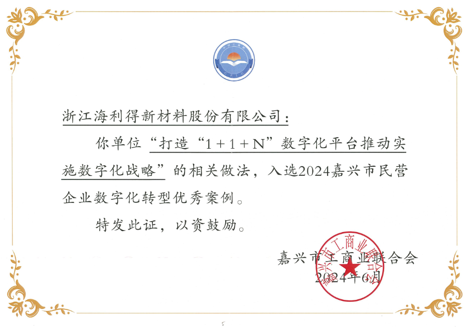 近日,嘉興市工商業聯合會舉辦了“科創未來·數智賦能”政銀企懇談會,會上發布了2024年嘉興民營企業“數轉智改”典型案例,公司《打造“1+1+N”數字化平臺推動實施數字化戰略》榜上有名。